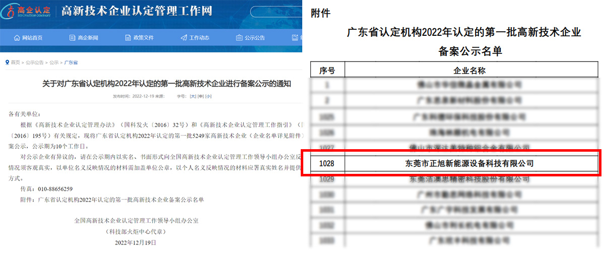 近日,關于對廣東省認定機構2022年認定的第一批高新技術企業名單公示,經過嚴格篩選和評審,東莞市正旭新能源設備科技有限公司成功入圍,正旭已連續四次十年成功通過認定為國家高新技術企業。這是繼正旭成功入圍廣東工信廳2022創新型中小企業名單公示...
