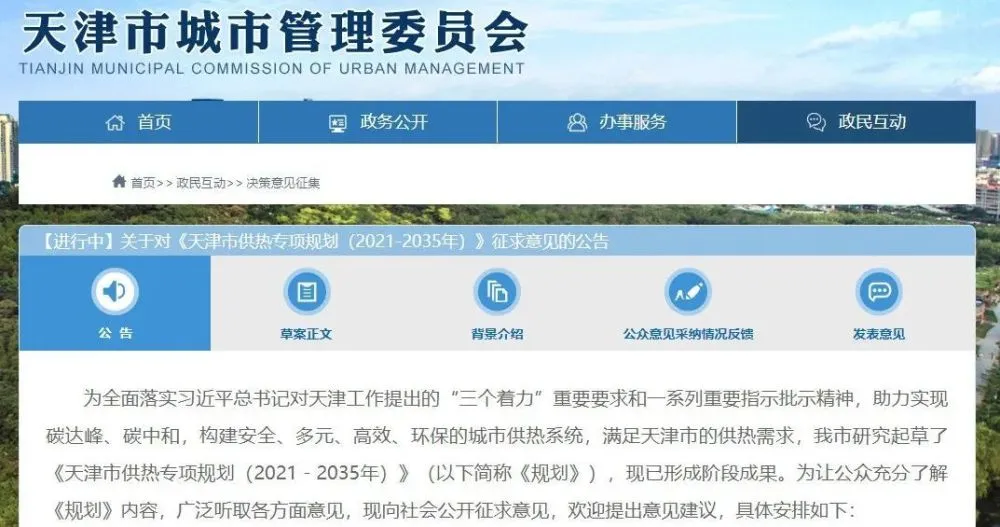 11月23日,天津市城市管理委員會(huì)、天津市城市管理研究中心官網(wǎng)發(fā)布關(guān)于對(duì)《天津市供熱專項(xiàng)規(guī)劃(2021-2035年)》征求意見(jiàn)的公告,為全面落實(shí)國(guó)家生態(tài)文明思想和一系列重要指示批示精神,構(gòu)建安全、多元、高效、環(huán)保、智慧的城市供熱系統(tǒng),提高資...