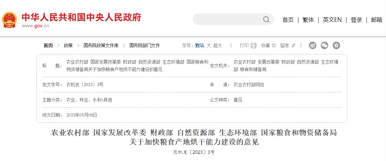 國家五部委發布關于加強糧食產地烘干能力建設的意見