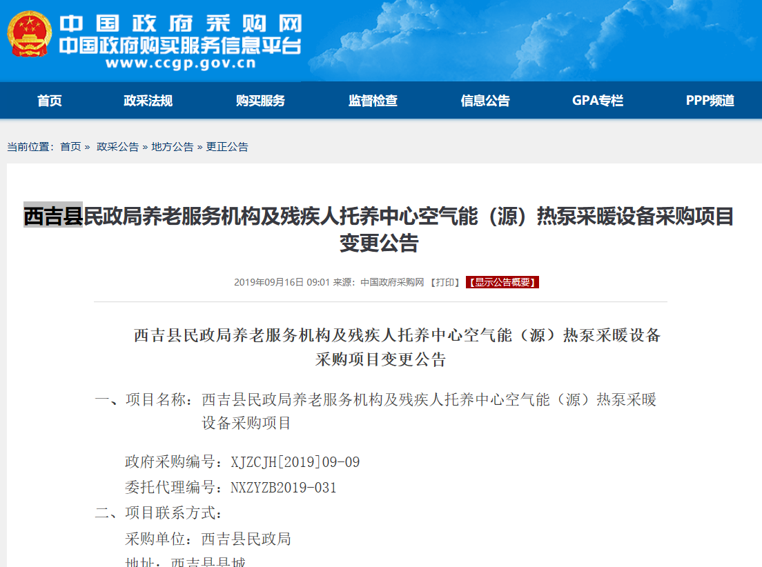 【最新】西吉縣養老服務機構及殘疾人托養中心空氣能采暖設備采購項目變更公告