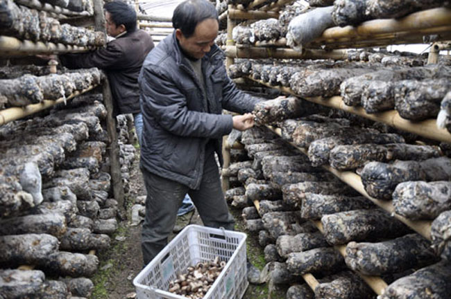 采收前一天禁止?jié)菜?,適時(shí)采收。厚菇應(yīng)在四五成熟時(shí)采收,一般采收均不能超過八成熟。采收時(shí)應(yīng)選擇香菇菌膜自然破裂,菌蓋尚未開傘,邊緣內(nèi)卷,菌褶伸開的無病變、無畸形的菇體。采收時(shí)要用手指輕輕掐住菌柄扭取,不得碰菌褶,輕拿輕放,積壓不得過厚。搬運(yùn)或置于竹筐時(shí),應(yīng)避免碰壓變形或破損。剪除菇根,留菇柄長1-2厘米。分揀花菇、厚菇、薄菇,然后按品種與大小不同分裝于盤中,在陽光下暴曬2-3小時(shí),以去除部分水分。