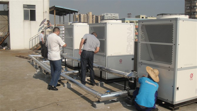 以深圳某電鍍廠流水線為例,采用正旭研發(fā)的電鍍熱泵作為加熱恒溫設(shè)備,高溫空氣能熱泵以空氣為熱源,制取高達(dá)80℃的高溫?zé)崴疂M足電鍍企業(yè)非消耗性工藝用水需求,夏季還可以將冷氣引入車間和辦公室,獲得免費(fèi)冷氣。高溫水源電鍍熱泵在冷凝側(cè)制熱為電鍍生產(chǎn)線提供高溫?zé)崴耐瑫r(shí),還可實(shí)現(xiàn)蒸發(fā)側(cè)制冷的功能,為電鍍廠的車間和辦公室提供免費(fèi)冷氣,節(jié)能改造綜合能效高達(dá)7.0。