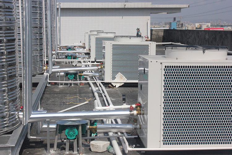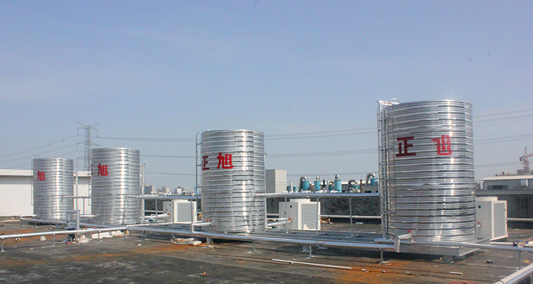 水箱和機(jī)組安裝在樓頂,冷熱水管在路面與客戶(hù)水管對(duì)接。熱泵熱水系統(tǒng)主要由熱泵熱水機(jī)組,不銹鋼保溫水箱、循環(huán)系統(tǒng)、補(bǔ)水系統(tǒng)、控制系統(tǒng)和管道配件組成。主機(jī)安裝正旭熱水機(jī)組,儲(chǔ)熱水箱連接熱水管路通向各個(gè)用水點(diǎn)。其采用強(qiáng)制循環(huán)定溫放水,熱水箱儲(chǔ)水方式,運(yùn)行穩(wěn)定。同時(shí),整個(gè)系統(tǒng)控制采用智能化控制,24小時(shí)準(zhǔn)確進(jìn)行水溫、水位檢測(cè),保證系統(tǒng)安全穩(wěn)定運(yùn)行,實(shí)現(xiàn)無(wú)人管理。