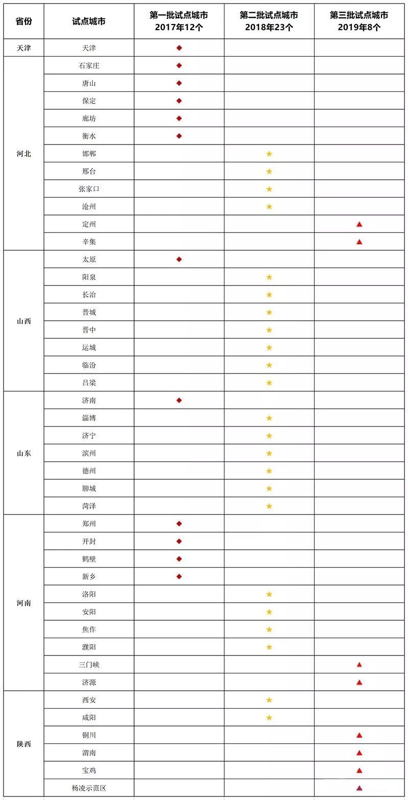 2019年其中新增的8個(gè)城市被納入第三批試點(diǎn)范圍,分別為河南省的三門峽和濟(jì)源,陜西省的銅川、渭南、寶雞、楊凌示范區(qū),河北省的定州、辛集。河北作為污染最嚴(yán)重的地區(qū),推廣力度大。而河南人口巨大,采暖用戶也甚多。