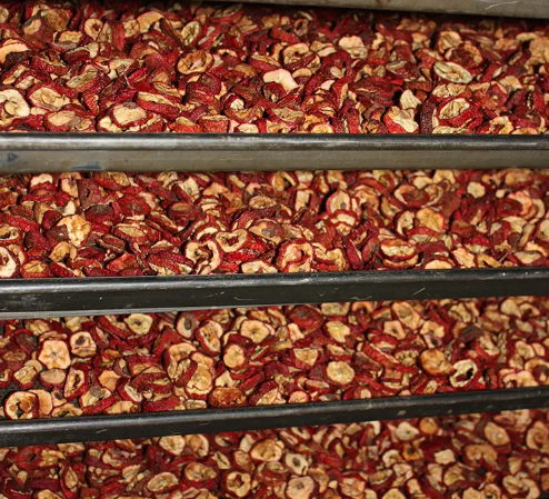 1. 挑選大小均一,無病蟲害,外形飽滿的山楂果子,洗凈切片,將果片均勻放進(jìn)物料盤,平鋪厚度不宜過厚;