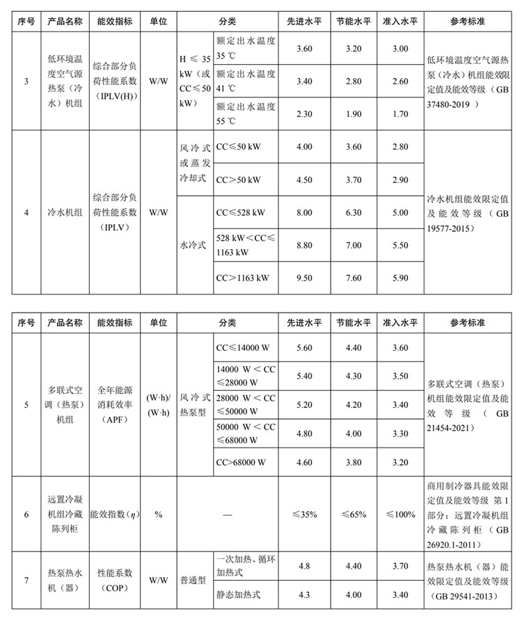 為貫徹落實《中共中央國務院關于完整準確全面貫徹新發展理念做好碳達峰碳中和工作的意見》《2030年前碳達峰行動方案》和《“十四五”節能減排綜合工作方案》有關部署,推動重點用能產品設備能效水平的提升,促進相關產業提質升級,加快淘汰落后設備,鼓勵消費者擴大綠色消費,助力實現碳達峰碳中和。國家發改委、工業和信息化部、財政部、住房城鄉建設部、市場監管總局近日聯合發布《重點用能產品設備能效先進水平、節能水平和準入水平(2022年版)》,其中“低環境溫度空氣源熱泵(冷水)機組”、“冷水機組”、“熱泵熱水機(器)”入選。