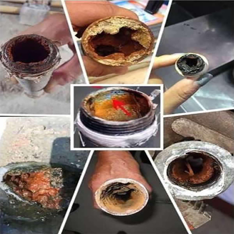熱泵系統在制熱過程中,隨著熱水不斷蒸發和濃縮,水中鈣鎂離子會發生化學反應,產生難溶性固體沉淀物質,并粘附在換熱器管壁、熱水管道內壁、水箱內膽等位置,形成阻礙熱傳遞的“水垢”。由此可知水垢形成的兩個條件,一是水溫達到水垢生成的臨界點60℃以上,二是水質差、含鈣、鎂離子等重金屬離子較多。