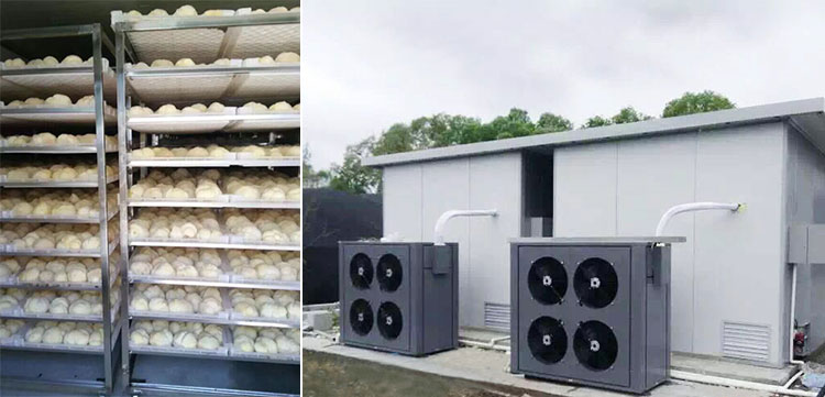 以正旭在哈爾濱某猴頭菇基地烘干項(xiàng)目為例,該項(xiàng)目共有8個(gè)烤房,共安裝了8臺(tái)15P正旭分體式空氣源熱泵烘干機(jī)。設(shè)計(jì)每個(gè)烘烤房最高溫度70℃,每次烘干3000公斤,除水量60%,烘干時(shí)間60個(gè)小時(shí)。項(xiàng)目自2016年完工以來(lái),七年間一直穩(wěn)定運(yùn)行,得到客戶(hù)的積極認(rèn)同。